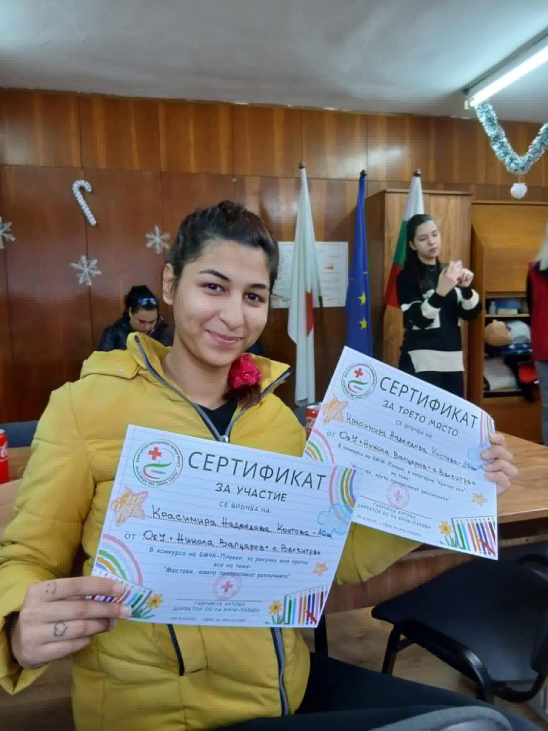 Първа и трета награда в областен конкурс за есе спечелиха десетокласничките Бонка Божинова и Красимира Костова. Надпреварата бе организирана от Български младежки Червен кръст-Плевен и посветена на месеца на хуманитарното образование. Момичетата писаха на тема „Мостове, които преодоляват различията“ и с отличното си представяне заслужиха престижните награди.