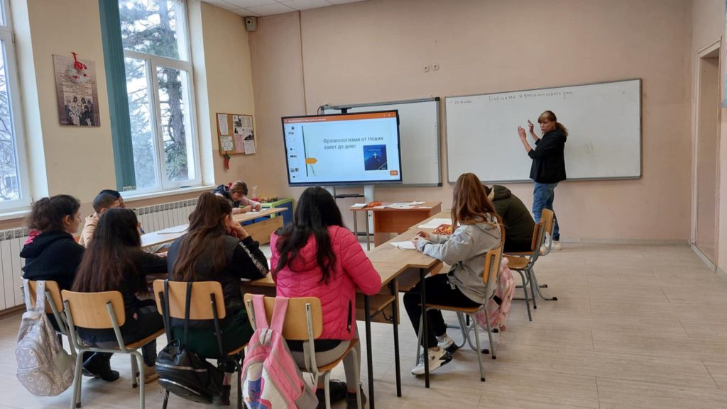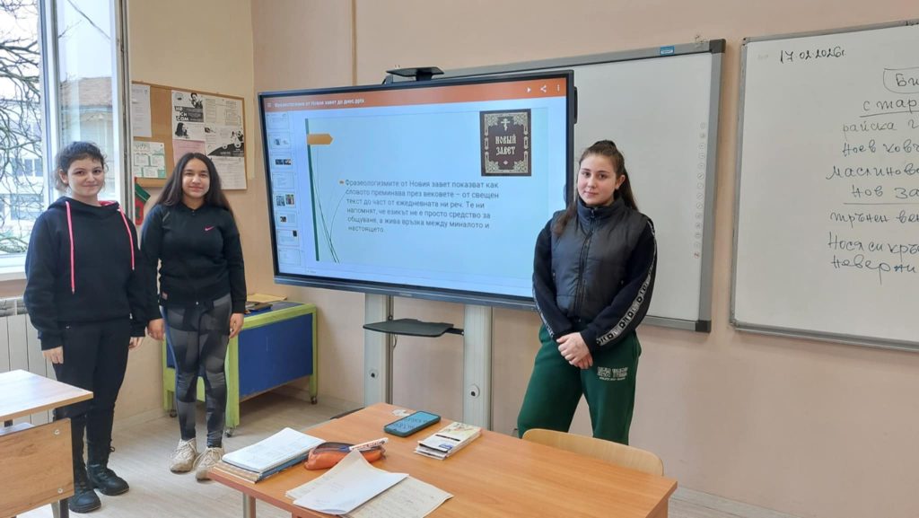 Открит урок „Библията и фразеологизмите днес“ проведоха учениците от осми клас. Темата по български език и литература бе представена чрез поредица от интерактивни методи, които превърнаха децата от пасивни слушатели в активни участници. Беатрис, Камелия и Емилия представиха свой проект по темата. Всички ученици дискутираха и развиваха уменията си за работа в екип. Осмокласниците заедно стигнаха до отговора на въпроса какво езикът ни днес е наследил от Библията и защо?